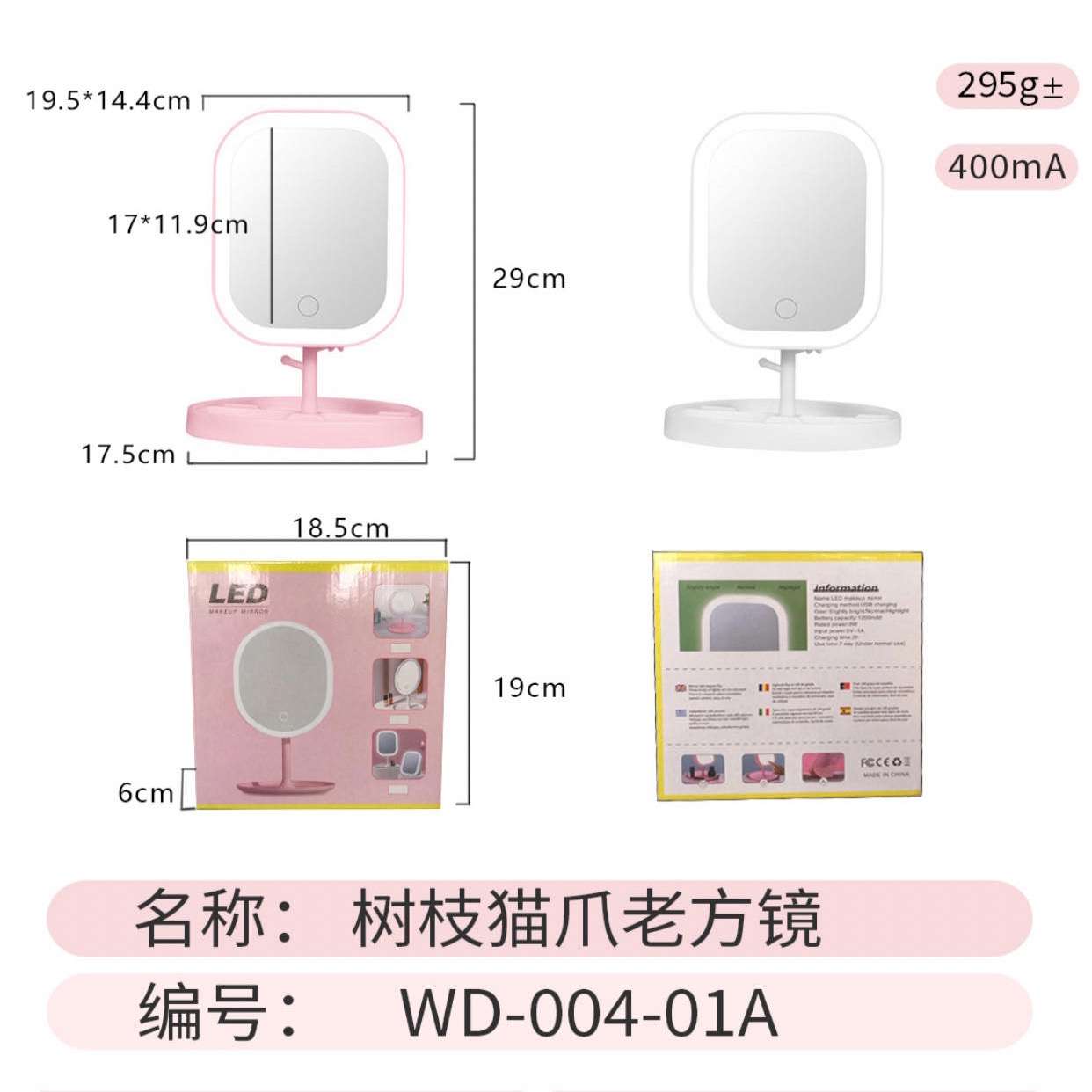 آیینه بکلایتدار به همراه سه طیف نوری آفتابی،مهتابی و یخی با قابلیت تنظیم شدت نور به همراه باتری قدرتمند قابل شارژ با پورتC عرضه شده است.این مدل آیینه دارای چند شاخه برای آویزان کردن زیورآلات و نیز باکس برای نگهداری لوازم آرایشی و غیره میباشد. شما با استفاده از این آیینه به راحتی میتوانید حتی در نور بسیار کم آرایش کنید؛ همچنین شدت نور رینگ لایت دور اینه علاوه بر قابلیت تغییر با نگه داشتن دکمه لمسی روی آینه قابلیت تنظیم را دارد. لازم به ذکر است روکش جیوه به کار رفته در این محصول فوق العاده واضح و شفاف بوده و به هیچ عنوان کوچک و یا بزرگ نمایی ندارد و چهره شما رو بدون تغییر زاویه به شما نمایش میدهد. آینه رینگ لایت مدل WD-004-01A مستطیلی با حاشیه گرد و دارای استند باکسی متوسط میباشد.برای نصب قطعات ابتدا صفحه شیشه اش آیینه را بر روی سطحی کاملا صاف قرار دهید سپس با فشار کنترل شده پایه سمت خار لولایی را در جای خود محکم کنید سپس در همان وضعیت باکس را در جای خود بر روی پایه شاخه ای قرار داده و 90 درجه بچرخانید تا محکم شود.