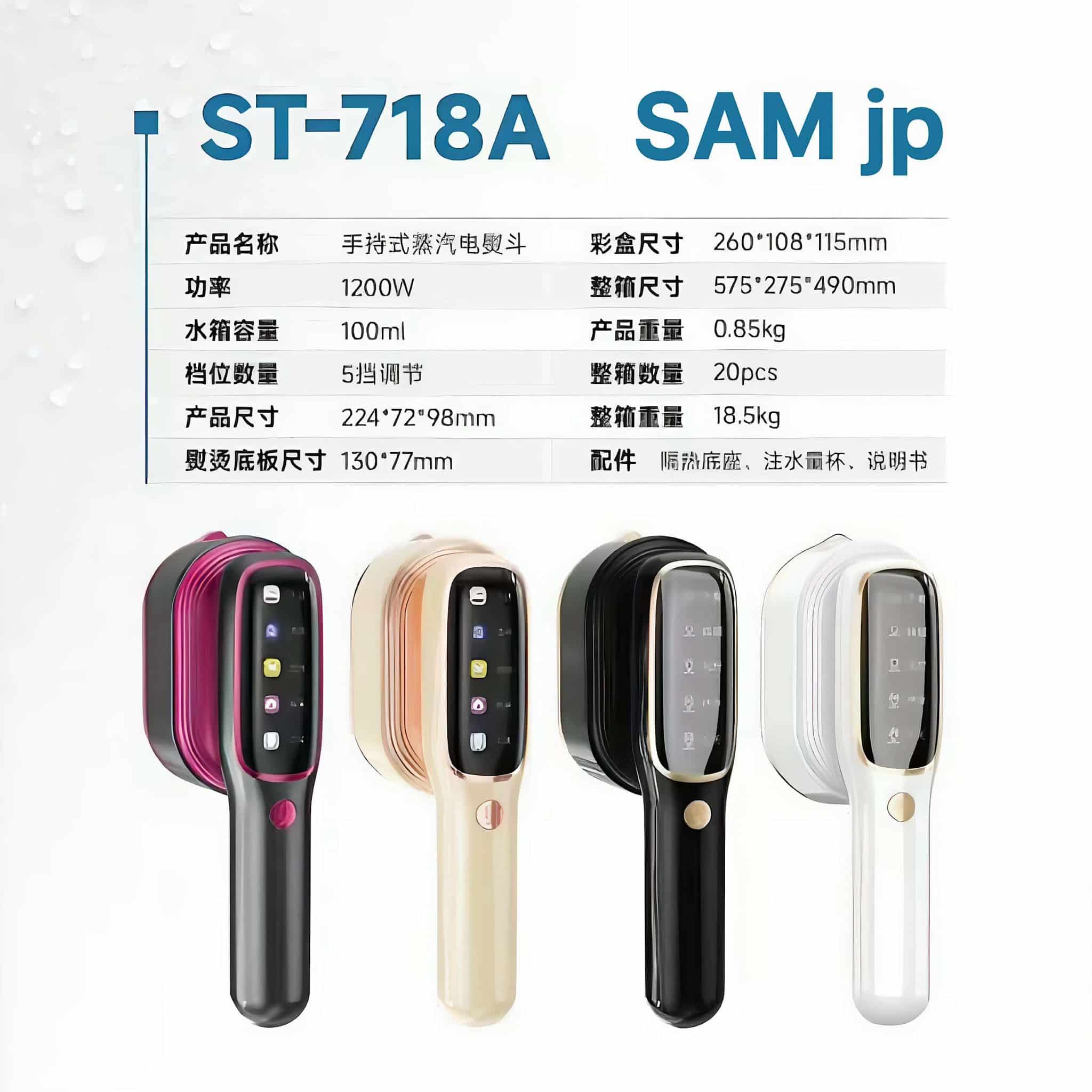 اتو بخارگر 1200 وات کد ST-718A SAMjp این دستگاه قدرتمند،با زیبایی و راحتی عملکرد خود شما را شگفت زده میکند و هیچگاه شما را ناامید نخواهد کرد.بخارگر و اتو پرتابل محصولی قدرتمند و دو کاره هم برای اتو زدن و هم بخارزنی البسه به صورت ایستاده میباشد.این محصول برای پاشش بخار از موتور توربینی براشلس ۲ پره استفاده میکند.قدرت پاشش بخار این محصول 20 میلی گرم در دقیقه و توان مصرفی آن 1200 وات میباشد. این اتو بخارگر دارای صفحه نمایش رنگی با 5 برنامه و سطح کاری و کفی با ابعاد ۸ در ۱۳ سانتی متر و حجم مخزن ۱۰۰ میلی لیتری میباشد.حالت اتوی خشک،الیاف پشم طبیعی،الیاف پلی استر،کتان و بخارپاش تحت فشار از گزینه های قابل انتخاب در این اتوی بخارگر میباشد.این اتو بخارگر همراه با کابل بلند روکش سیلیکونی مقاوم و سه شاخه فیوزدار و کفی استند سیلیکونی نسوز و‌کاپ آب و صفحه نمایش رنگی ضدآب(( تنها در مدل SAMjp ))بارنگ طوسی و کفی صورتی ارسال میشود.لازم به ذکر است بقیه مدلها به غیر از SAMjp با صفحه نمایش LED تک رنگ سفید و در دو رنگ بدنه سفید و مشکی ارسال میشوند.
