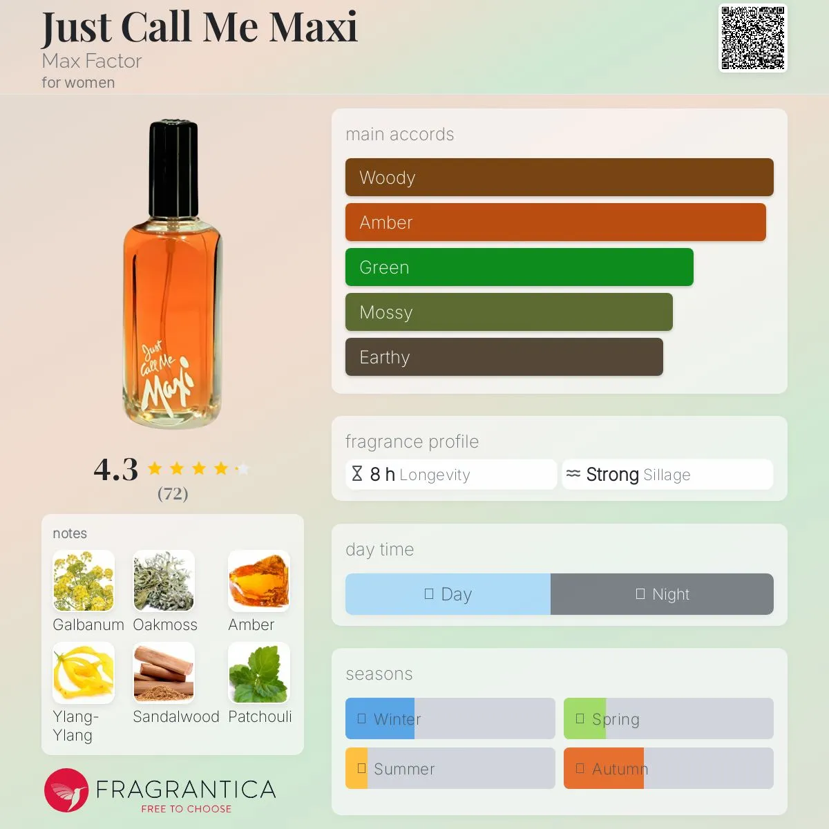 ادکلن جاست کال می مکسی جزء قدیمی ترین و محبوب ترین عطرهای دسته ادکلنهای مشترک زنانه و مردانه unisex است که یک حس نوستالژیک در مصرف کننده و اطرافیانش زنده می کند. این عطر، گزینهای عالی برای هدیه به افراد بزرگتر خانواده به حساب میآید. جاست کال می مکسی، با رایحهای گرم، تند و تلخ، نه تنها ماندگاری خوبی دارد بلکه پخش بوی مناسبی هم ارائه میدهد. استفاده از این عطر در طول روز و به ویژه در روزهای سرد سال، انتخابی هوشمندانه به نظر میرسد. این عطر کلاسیک که در سال 1976 به بازار معرفی شد، جزو اولین عطرهای تجاری مردانه است و هنوز هم خاطرات شیرینی را در ذهن بسیاری زنده میکند.عطر مکسی مردانه زنانه با توجه به ترکیبات به کار رفته در آن در گروه بویایی شرقی ، گلی قرار میگیرد و آکوردهای چوبی و علفی و خاکی در رأس هرم بویایی این عطر قرار دارد.