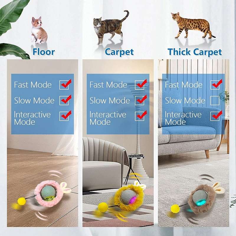 اسباب بازی گربه مدل توپ بازی هوشمند طرح موشی توپ اتوماتیک مدل موشی اسباب بازی هوشمند مخصوص حیوانات خانگی میباشد که در مقایسه با توپهای مشابه علاوه بر اینکه به طرفین به طور هوشمند حرکت میکند و با برخورد به موانع تغییر مسیر میدهد با صدای خود عامل تحریک هر چه بیشتر پت شما برای بازی و جنبوجوش میشود.برای جذب هر چه بیشتر پت شما با توجه به شدت شنوایی گربه ها از صدای نویز دار جیرجیرکی ممتد و ضربه های منظم استفاده شده است شدت این صدا به گونه ای است که موجب مزاحمت صاحب پت نشود و تنها گربه ها متوجه آن شوند.این توپ با پورت C شارژ نیم ساعته را به شما میدهد.همچنین مدل بازی در این توپ به طور انتخابی در سه حالت با چراق قرمز(سرعتی)، آبی (نامنظم)و بنفش(طعمه)با الگوریتمهای متفاوتی میباشد.
