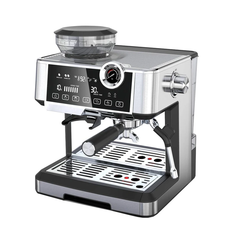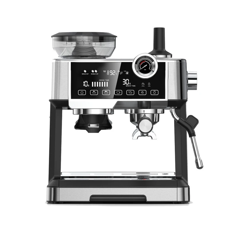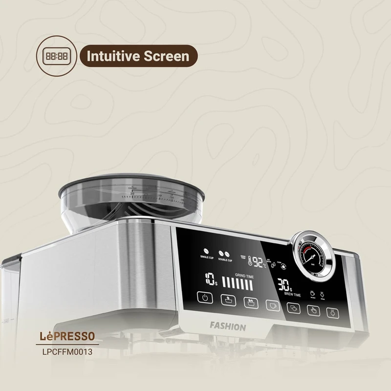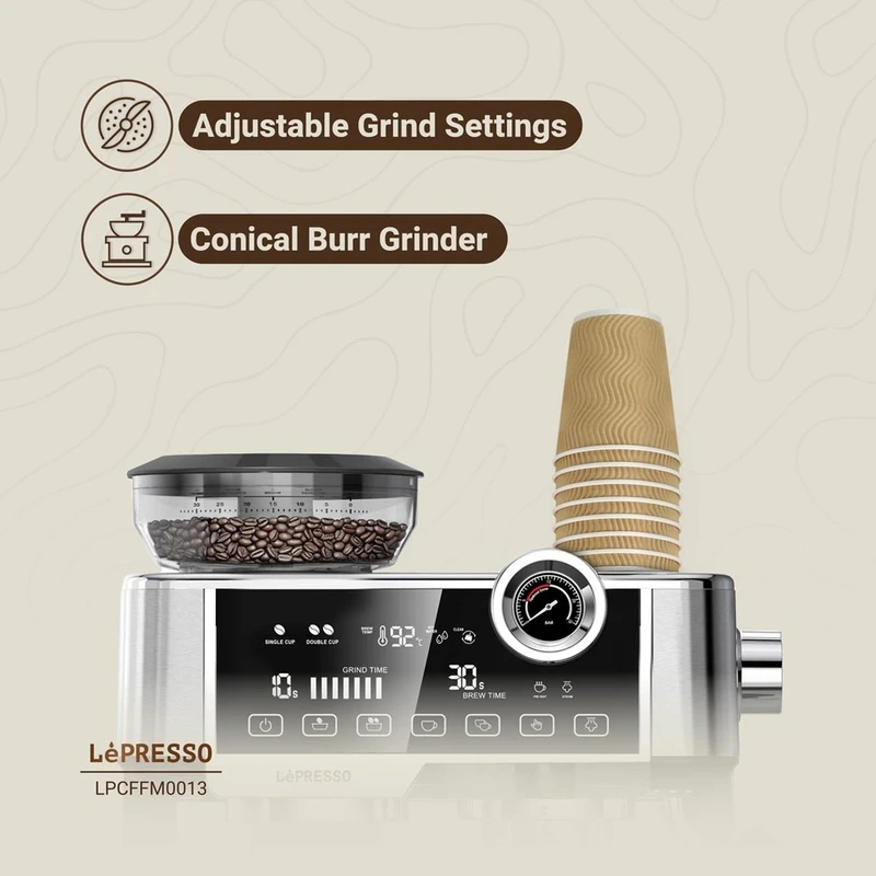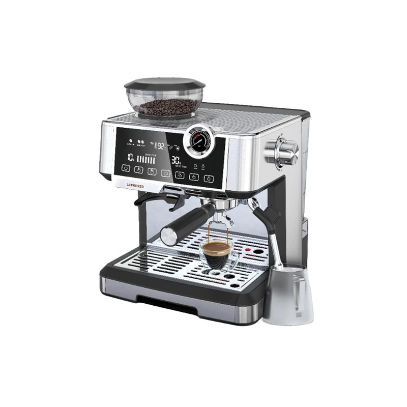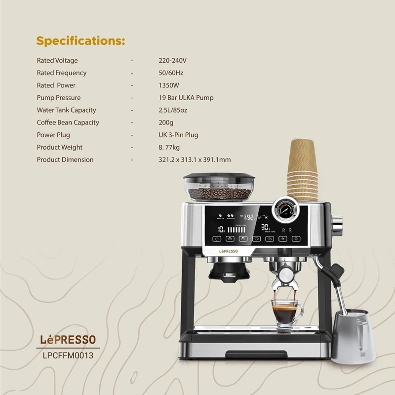 این دستگاه به یک پمپ فشار 19 بار ULKA مجهز است که استخراج بینقص عصاره و ساخت اسپرسویی غنی و پرعطر و طعم و البته خامه ای را تضمین میکند. طراحی دستگاه بسیار ساده و در عین حال کاربرپسند است.این اسپروساز دارای دو شاخه استاندارد بریتانیا (UK 3-Pin) و یک رابط لمسی هوشمند میباشد که به شما امکان تنظیم آسان و شخصیسازی اسپرسوساز براساس سلیقه تان را میدهد. آسیاب مخروطی پیشرفته این مدل، دانههای قهوه را بهصورت یکنواخت آسیاب و عطر و طعم کامل قهوه را حفظ مینماید. همچنین، تنظیمات آسیاب به شما این امکان را میدهد تا قهوه خود را بر اساس سلیقه شخصیتان تنظیم کنید. مخزن آب این مدل با گنجایش 2.5 لیتری فضای کافی برای کاهش دفعات پر کردن آب را فراهم کرده و فشار داخل دیگ بخار نیز از طریق گیج دیگ بخار بهراحتی قابل مشاهده است. صفحه گرمکن فنجان، فنجانهای شما را به دمای بهینه گرم نگه میدارد تا اسپرسویی گرم و خوشطعم داشته باشید. با اسپرسوساز پیشرفته 0013 LePresso، میتوانید اسپرسویی با کیفیت باریستا را به راحتیهر چه تمام در خانه و محل کار خود تهیه کنید. این دستگاه پر از ویژگیهای مدرن، تجربه نهایی دمآوری قهوه را به شما هدیه میدهد و شما را به یک فنجان اسپرسوی بینقص در هر محیطی دعوت میکند.