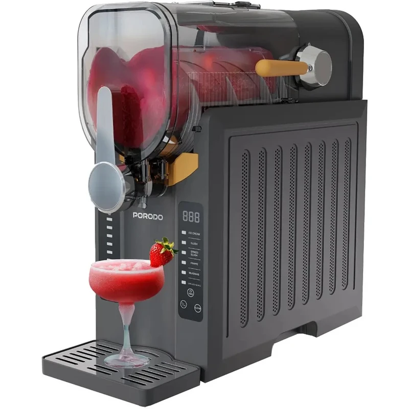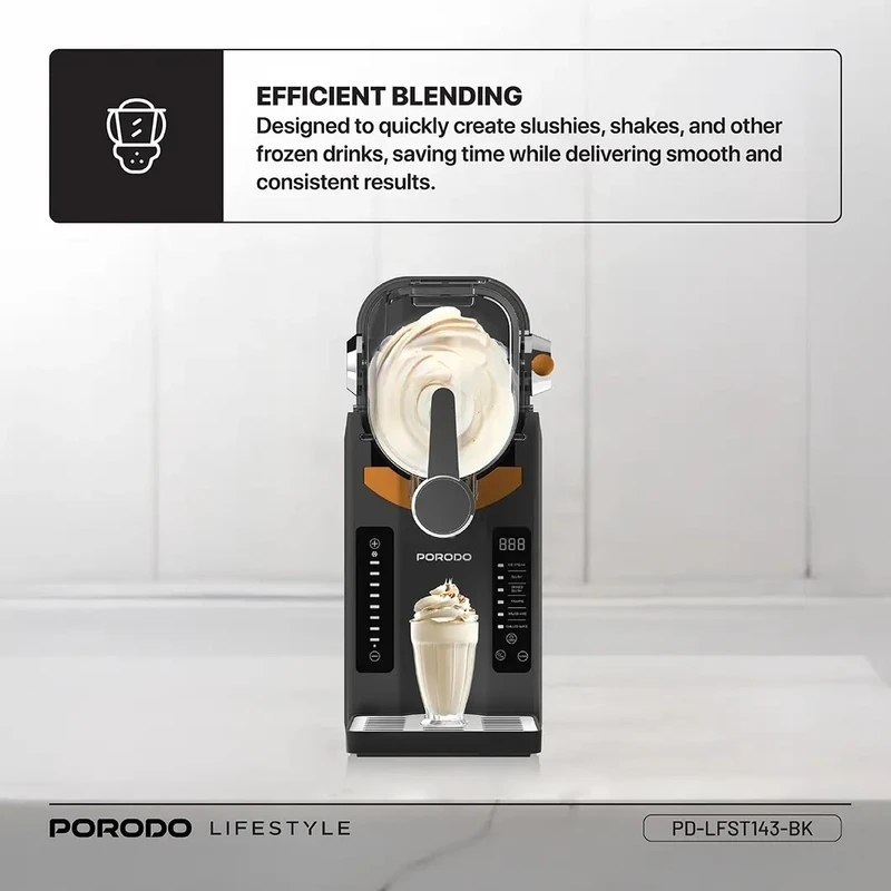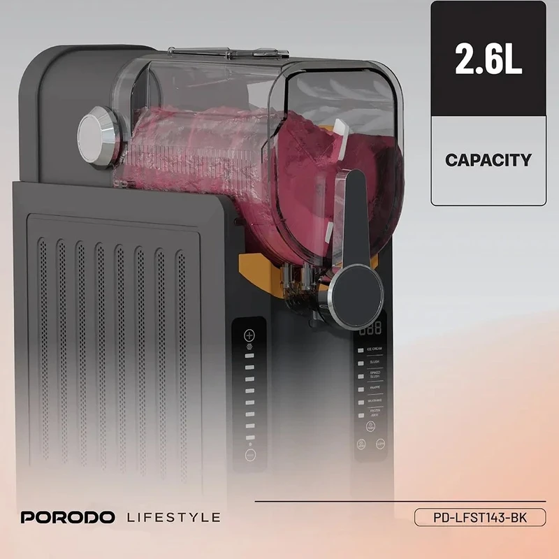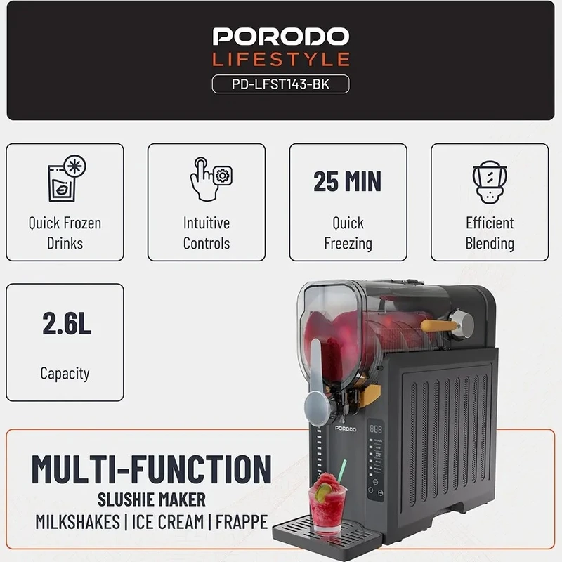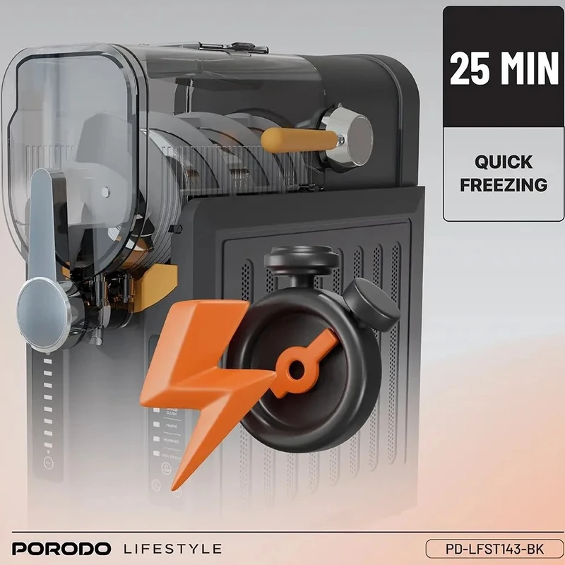 دستگاه یخ در بهشت، بستنی‌ساز و اسموتی‌ساز پرودو PD-LFST143؛ انتخابی حرفه‌ای برای تهیه نوشیدنی‌های یخ‌زده و دسرهای خنک با کیفیت بالا و سرعت بی‌نظیر می باشد. اگر به دنبال یک دستگاه چندکاره برای تهیه انواع نوشیدنی‌های یخ‌زده، بستنی نرم و اسموتی‌های خوشمزه هستید، دستگاه پرودو مدل PD-LFST143 گزینه‌ای ایده‌آل برای خانه، کافی‌شاپ یا رستوران شماست. این دستگاه با طراحی مدرن، عملکرد قدرتمند و قابلیت‌های متنوع، تجربه‌ای حرفه‌ای از تهیه دسرهای خنک را فراهم می‌کند. این دستگاه با ظرفیت سخاوتمندانه 2.6 لیتر، برای تهیه حجم زیادی از نوشیدنی‌های گوارا ایده‌آل است. توان 200 وات آن، مخلوط کردن کارآمد را تضمین می‌کند. ولتاژ 220-240 ولت و فرکانس 50 هرتز، آن را برای استفاده در بریتانیا ایده‌آل می‌کند. این دستگاه دارای دوشاخه 3 پین است. می‌توانید به سرعت و به راحتی از کنترل‌های بصری استفاده کنید. از اسلاشی، کوکتل‌های یخ زده یا اسموتی‌ها تنها در عرض چند دقیقه لذت ببرید. طراحی مشکی آن به هر آشپزخانه‌ای ظاهری مدرن می‌بخشد. عملکرد قابل اعتماد آن، نتایج روان را در هر زمان تضمین می‌کند. چه میزبان مهمانی باشید و چه صرفاً هوس یک خوراکی خنک کنید، دستگاه اسلاشی ساز چندکاره Porodo انتخابی ایده‌آل برای نوشیدنی‌های سریع و منجمد است. مواد اولیه دلخواه خود (مانند آبمیوه، شیر، شکر، میوه) را آماده کنید. مخلوط را داخل مخزن 2.8 لیتری دستگاه بریزید. با استفاده از کنترل پنل اتوماتیک، حالت مورد نظر خود را انتخاب کرده و دستگاه را روشن کنید. پس از حدود 25 دقیقه، دسر یخی شما آماده سرو است! به همین سادگی است.
