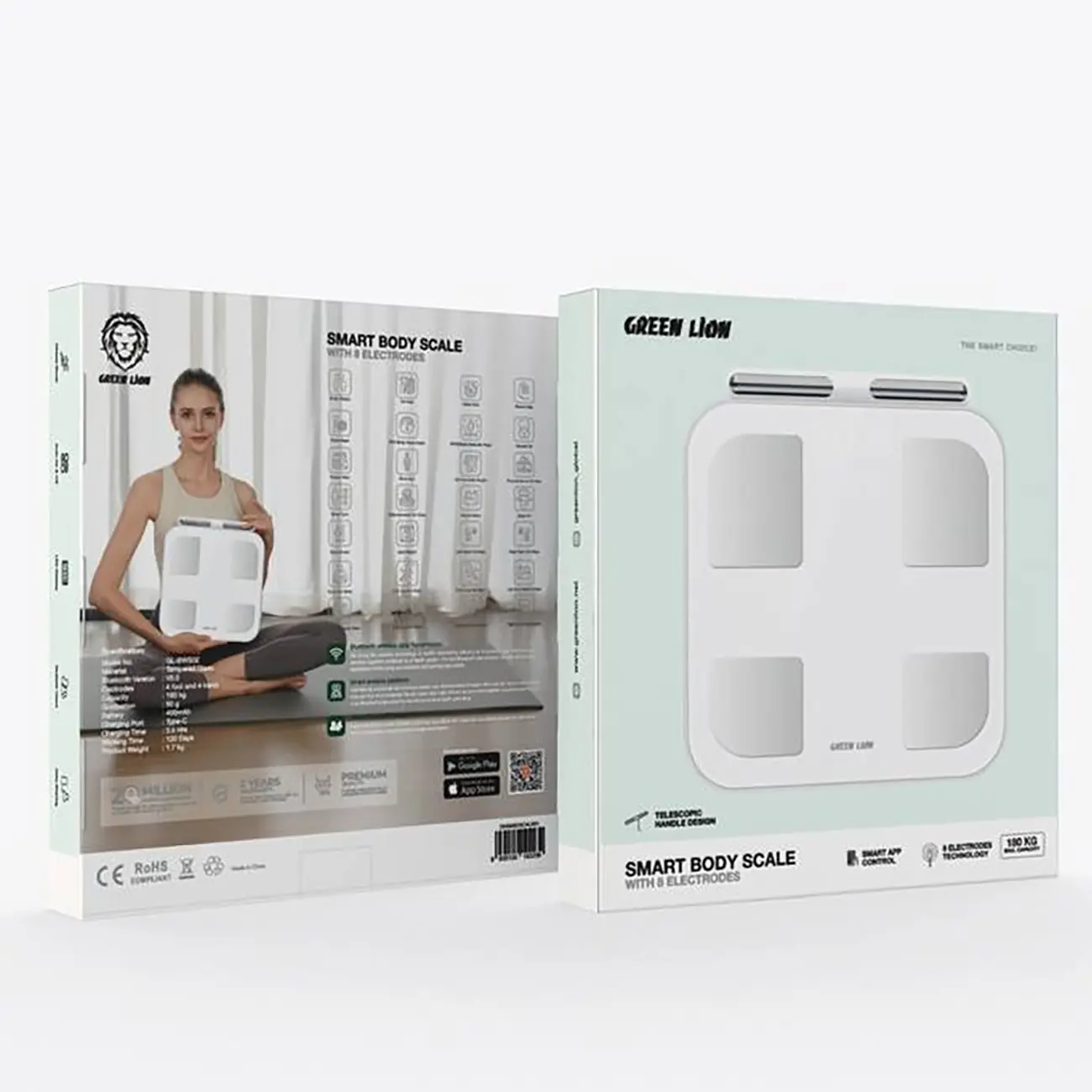 ترازو هوشمند گرین لاین مدل GREEN LION SMART BODY SCALE GL-BWS02 دارای 4 الکترود برای پاها و 4 الکترود برای دستها است. با استفاده از این الکترودها ترکیب بدن به صورت دقیق تحلیل میشود. بیشترین وزن قابل تحمل آن 180 کیلوگرم و محدوده دقت اندازه گیری 50 گرم است. اتصال این هوشمند با بلوتوث نسخه 5.0 انجام شده و با اندروید و ios سازگاری دارد.در واقع ترازویی هوشمند است که وضعیت بدنی را از جهات مختلف و خیلی دقیق بررسی میکند. چربی، آب، کسر توده استخوان، کسر توده عضلانی، اندازه گیری متابولیک، محاسبه BMI، سن بدن و اندازه گیری چربی احشایی از کاربردهای این ترازو است. امکان نمایش وضعیت بدن و ذخیره اطلاعات روی گوشی نیز امکان پذیر میباشد.
