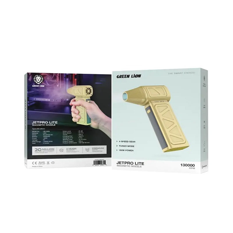 جت فن Green Lion Jet Pro Lite Magnetic Nozzle مجهز به موتور DC براشلس 180 وات است که جریان هوای فوق‌العاده با سرعت 130,000 دور در دقیقه تولید می‌کند. این ویژگی امکان انجام تمیزکاری دقیق و سریع قطعات حساس را فراهم می‌کند. کاربران حرفه‌ای می‌توانند از این قدرت برای دمیدن گرد و غبار یا جابجایی هوا در فضاهای کوچک بهره ببرند. موتور براشلس دوام بالا و عملکرد پایدار در طول زمان را تضمین می‌کند. تجربه کاربری با این توربو فن نشان می‌دهد که قدرت و دقت در یک دستگاه کوچک هم قابل دستیابی است.