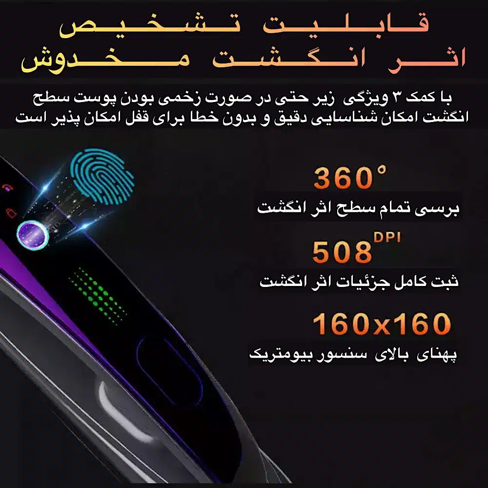 • امنیت بی رقیب: مجهز به سنسور اثر انگشت بادقت بسیار بالا، نمایشگر DPI512، هشدار صوتی و نوری، سیستم ضد شوک، ضد آب و قفل شب بند برای آرامش خیال همیشگی شما