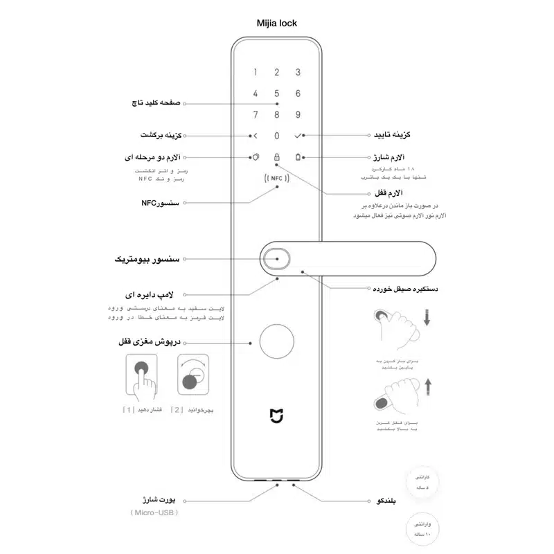 دستگیرههای هوشمند از لحاظ ظاهری تفاوتی با دستگیره های معمولی ندارند. اگر از نزدیک به آنها نگاه کنید، اسکنر اثر انگشت و صفحه کلید آن را مشاهده میکنید که متمایزترین المان ظاهری آن را تشکیل میدهند. بدنه طراحی یکپارچه داشته و طراحی مینیمال را روی مواد اولیه از آلیاژ آلومینیوم پیاده کرده است. اگر از مبحث زیبایی و طراحی مدرن دستگیره MJZNMS03LM عبور کنیم، به کیفیت متریال بدنه میرسیم که اهمیت ویژه ای برای خرید دستگیره دارد. دستگیره هوشمند mijia علاوه بر تدابیر امنیتی هوشمندی که دارد، در برابر ضربه، حرارت، آب و رطوبت، سرمای بیش از حد و فشار مقاومت خوبی نشان داده است. طبق ادعای سازنده، سطح دستگیره با فرآیند IML مات و ضد خش شده و سنسور اثر انگشت از جنس یاقوت دقیقا روی اهرم دستگیره تعبیه شده است تا دسترسی انگشت به آن ساده و سریع باشد.
