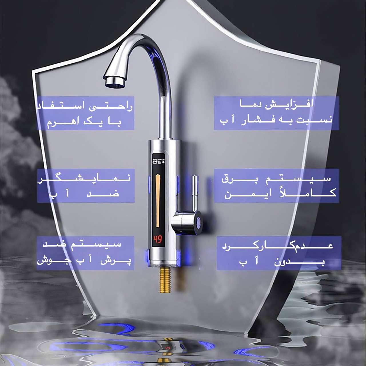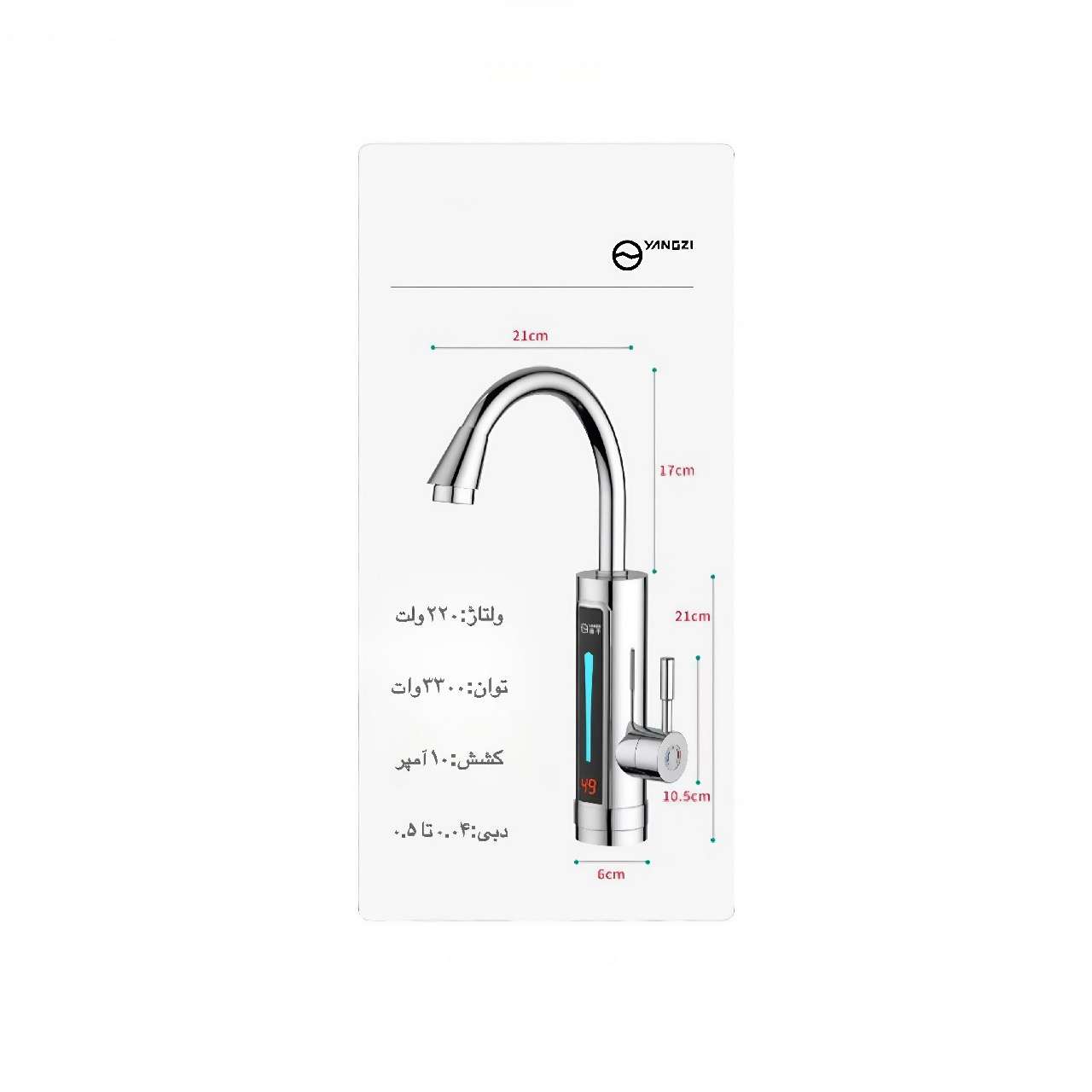 شیرآب المنتدار یانگزی طرح المک قو 3300 وات شیر آب المنت دار یانگزی مدل المک قو جدیدترین مدل شیر المنتدار برند یانگزی میباشد.این شیر المنت دار در کسری از ثانیه دمای آب را بسته به دبی خروجی و تنظیم اهرم تا دمای جوش میتواند بالا ببرد.این شیر برقی فقط به وردی آب سرد و پریز برق نیاز دارد و قابلیت نصب آسان و سریع از محاسن این شیر آب المنت دار میباشد.از مشخصات این محصول استفاده از متریال استیل باکیفیت ۳۰۴ در بدنه پایه و لوله و نیز pvc فوق فشرده در مغزی و منبع المنت با رو کش کروم ،سیستم گرمایش سیلکترون استریو و نمایشگر ضدآب جهت تنظیم دما اشاره کرد همچنین روکش مخزن المنت دارای چراغ ال ای دی درخشانی میباشد که جلوه خاصی به این محصول داده است.