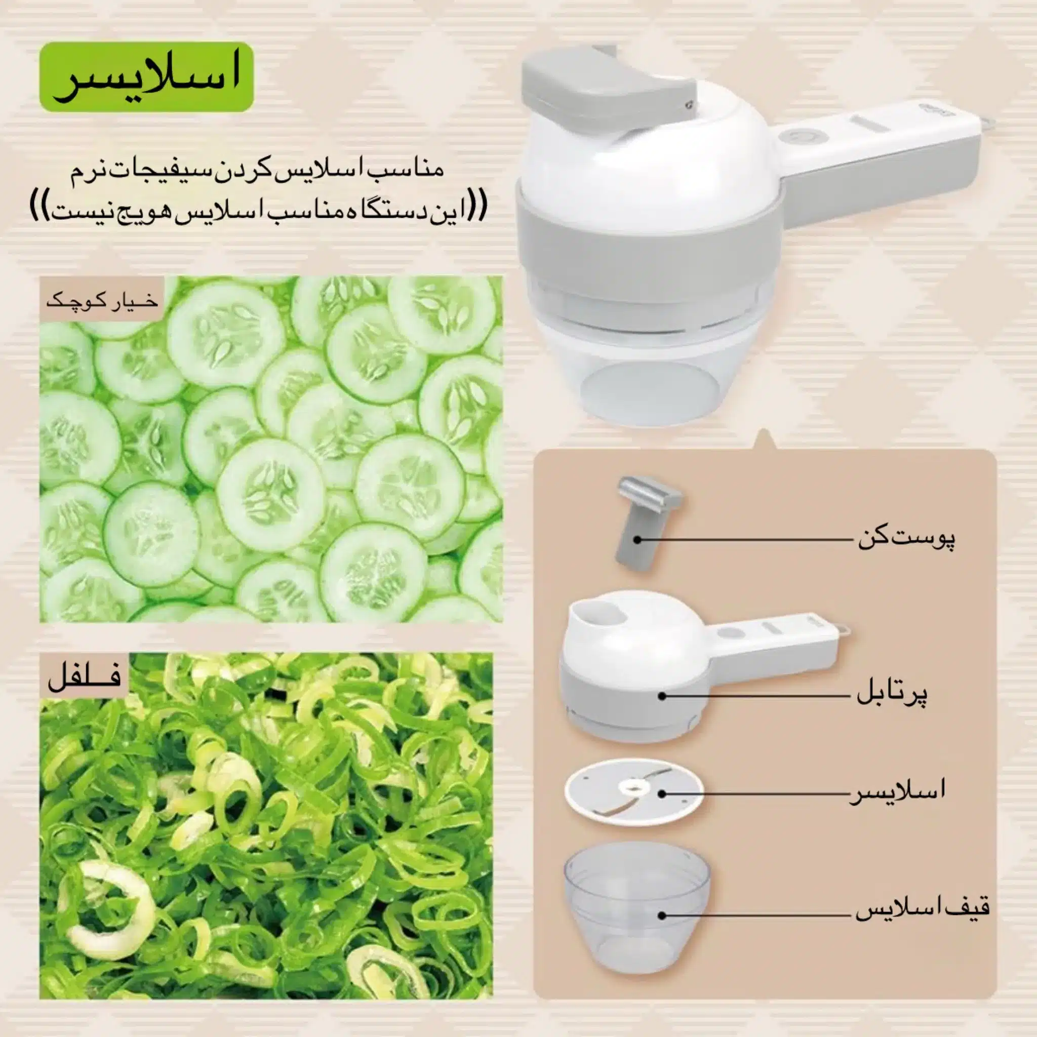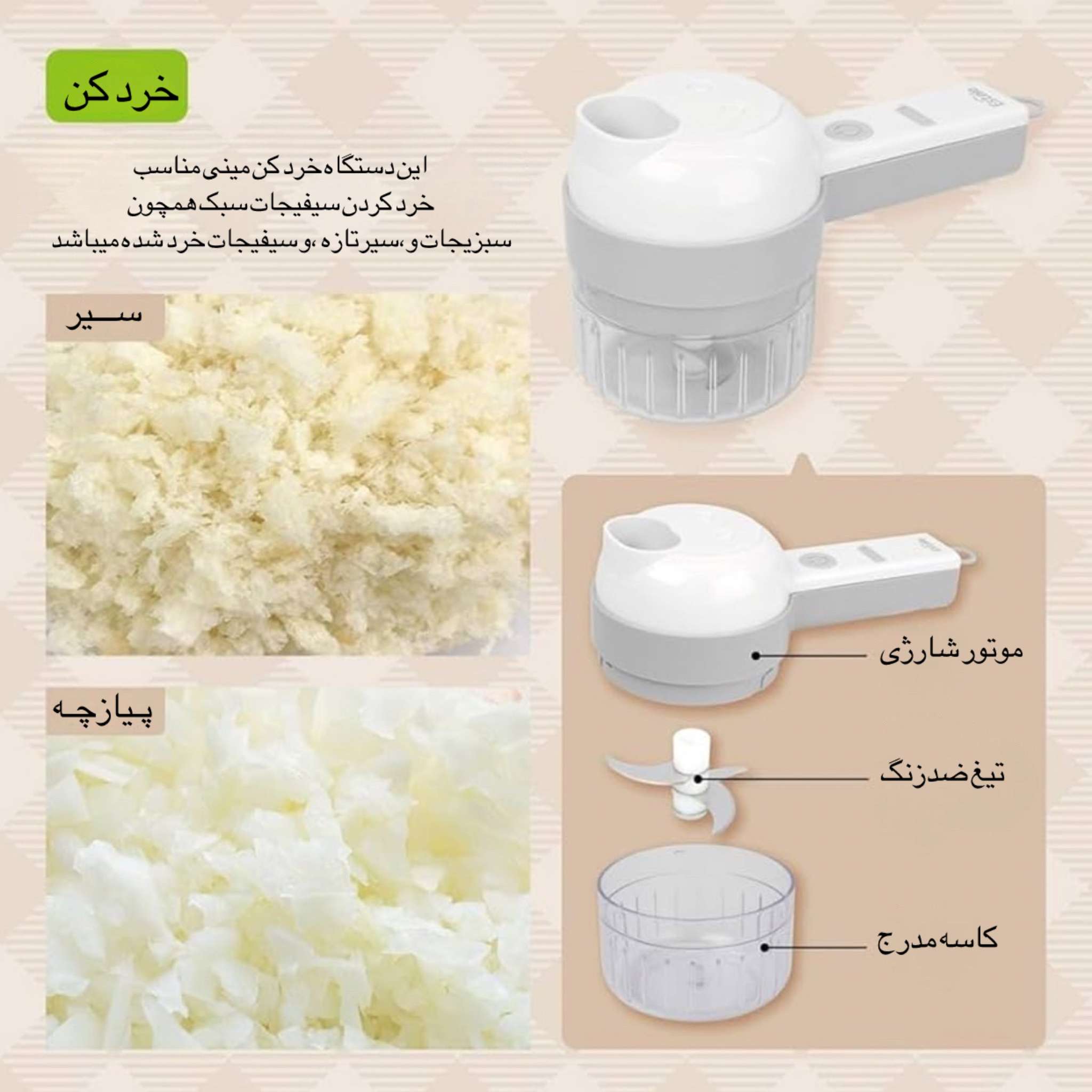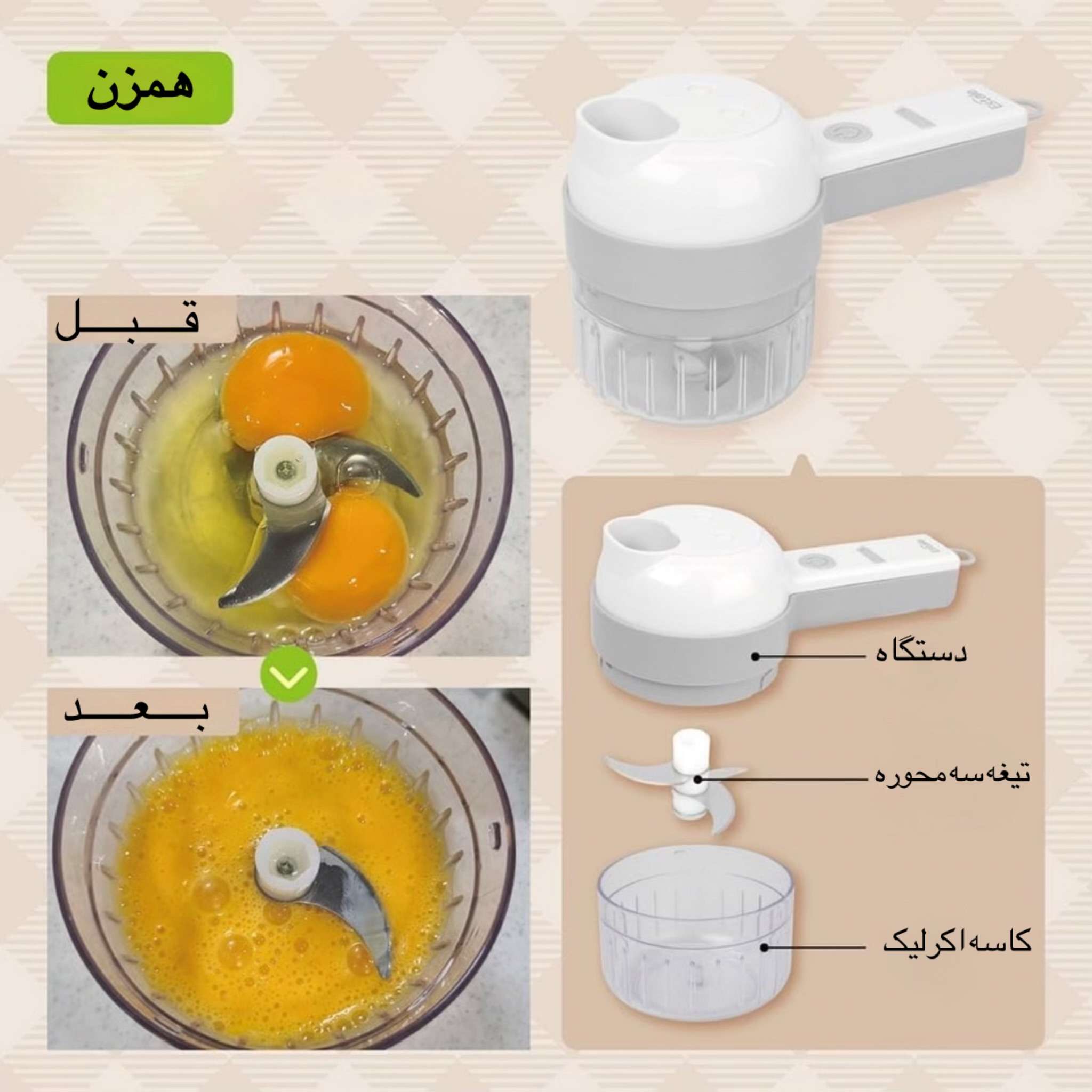 • قابلیت‌های چندکاره: شامل همزن، اسلایسر و خردکن، که به شما امکان می‌دهد انواع سبزیجات، برگ تازه، کرفس، سیر، خیار، قارچ، مارچوبه، فلفل و سیفیجات دیگر را به راحتی خرد و برش دهید.