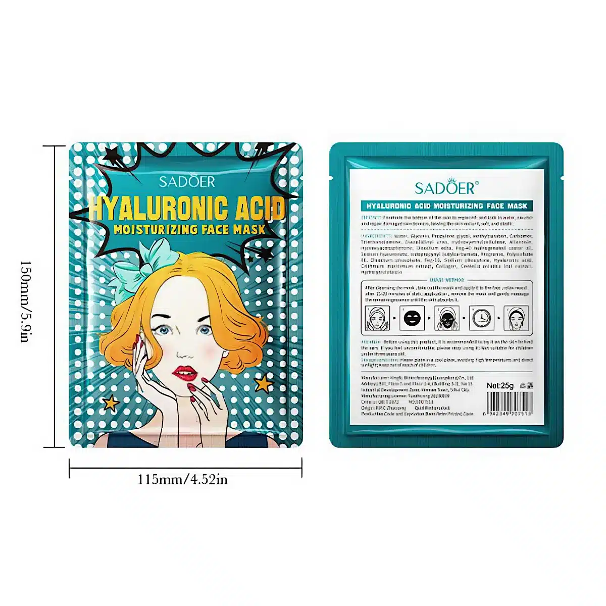 ماسک صورت سادور کمیک مدل هیالورونیک اسید دارای قابلیت آبرسانی عمیق میباشد که تاثیرات بیشماری بر پوست دارد به عنوان مثال :برای کاهش و بهبود چروکها مفید بوده که در نهایت پوست را جوانتر جلوه داده و رنگ آن را بهبود میبخشد، و پوست را نرم و لطیف جلوه میدهد.فیلرهای هیالورونیک اسید بهمنظور پشتیبانی از ساختار صورت و بافتهایی که ممکن است حجم یا انعطاف خود را به دلیل افزایش سن از دست داده باشند، مانند کوسنی حجیم عمل میکنند. همچنین این ماده سطح آب پوست را حفظ کرده و پوست را شاداب و لطیف نگه میدارد.