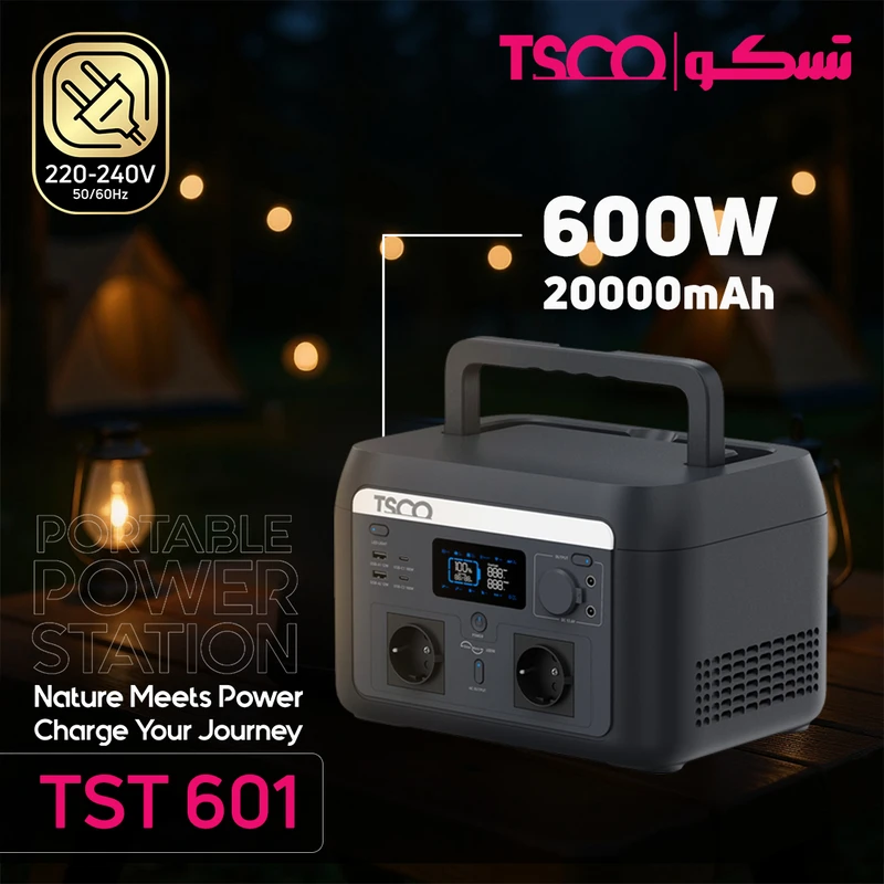 پاوراستیشن تسکو مدل TST 601 یک منبع انرژی قابلحمل و هوشمند است که برای قطعی برق، سفر، کمپینگ و استفاده خانگی طراحی شده است. این دستگاه با ترکیب قدرت، دوام و طراحی حرفهای، در هر شرایطی برق پایدار فراهم میکند. در قلب TST 601 باتری LiFePO4 با ظرفیت 512Wh قرار دارد که تا ۱۰ سال عمر مفید دارد. توان خروجی 600 وات (پیک 1000 وات) همراه با برق Pure Sine-Wave کیفیتی مشابه برق شهری ارائه میدهد. این مدل از شارژ دوطرفه سریع (Bidirectional Fast Charge) پشتیبانی میکند و تنها در ۱.۴ ساعت بهطور کامل شارژ میشود. امکان شارژ و دشارژ همزمان نیز وجود دارد. عملکرد UPS واقعی یکی از ویژگیهای کلیدی دستگاه است؛ در صورت قطع برق، در کمتر از ۱۰ میلیثانیه برق اضطراری فعال میشود تا سیستمها خاموش نشوند. TST 601 دارای ۹ خروجی و ۲ ورودی است؛ شامل دو خروجی AC، دو USB-A، دو USB-C با توان 100 وات، خروجی DC5521 و فندکی خودرو. ورودیها نیز شامل برق شهری، شارژ خودرو و پنل خورشیدی هستند. اتصال از طریق Wi-Fi، بلوتوث و اپلیکیشن موبایل امکان کنترل وضعیت شارژ، دما و توان مصرفی را از راه دور فراهم میکند. بدنه مقاوم ABS+PC با رنگ Midnight Blue، فن هوشمند داخلی و دسته آلومینیومی، دوام و حمل آسان را تضمین میکنند. وزن ۷ کیلوگرم و ابعاد 301×227×193 میلیمتر نیز جابهجایی آن را ساده کرده است. TST 601 یک پاوراستیشن 600 واتی حرفهای، سریع و قابلاعتماد برای تأمین برق در هر زمان و مکان است.