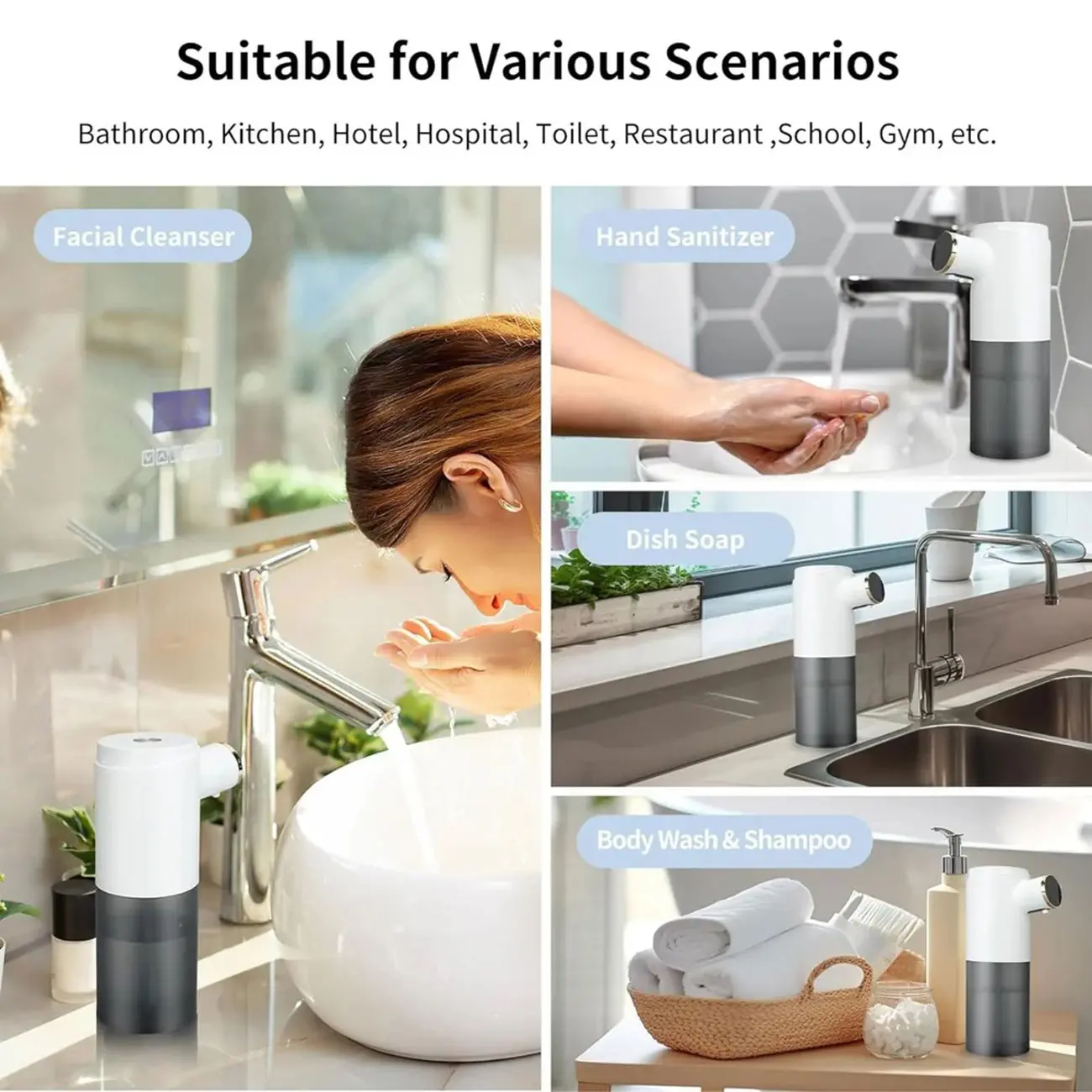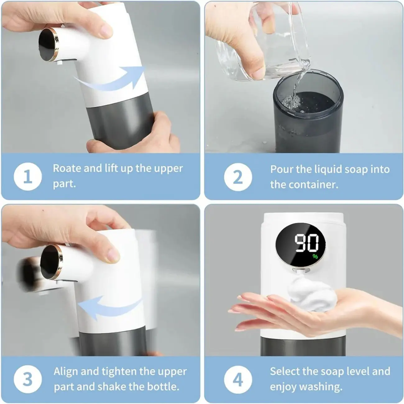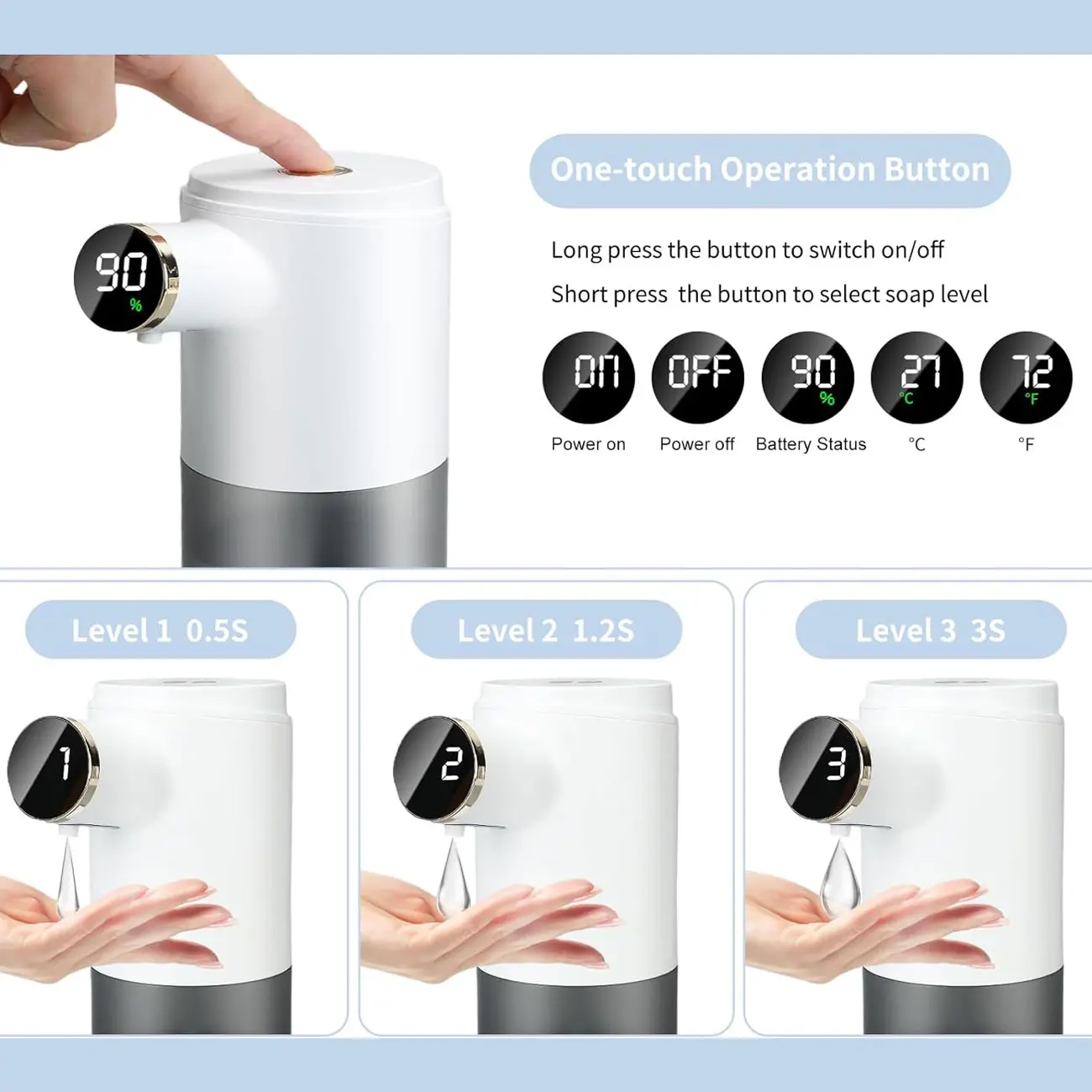 این محصول ضد آب بوده و دارای سه دنده قابل تنظیم است که میزان فوم را تنظیم می کند. دنده اول 0.8 ثانیه، دنده دوم 1.2 ثانیه و دنده سوم 2 ثانیه پمپاژ می کند. پس از هر بار شارژ کامل در صورت استفاده از دنده اول می توانید حدود 8000 بار از این دستگاه استفاده کنید. همچنین دنده دوم امکان 7000 بار استفاده در هر بار شارژ و دنده سوم نیز امکان 6000 بار استفاده را دارد. این دستگاه صابون دارای صفحه نمایش LED نیز می باشد. شما می توانید این محصول را با نگه داشتن دکمه ی پاور بالای آن روشن کنید. با زدن این دکمه نیز می توانید دنده ها را تغییر دهید و میزان فوم خارج شده از دستگاه را تنظیم کنید. همچنین این محصول امکان نمایش دما را نیز دارد که می توانید آن را بر روی فارنهایت یا سلسیوس تنظیم کنید.